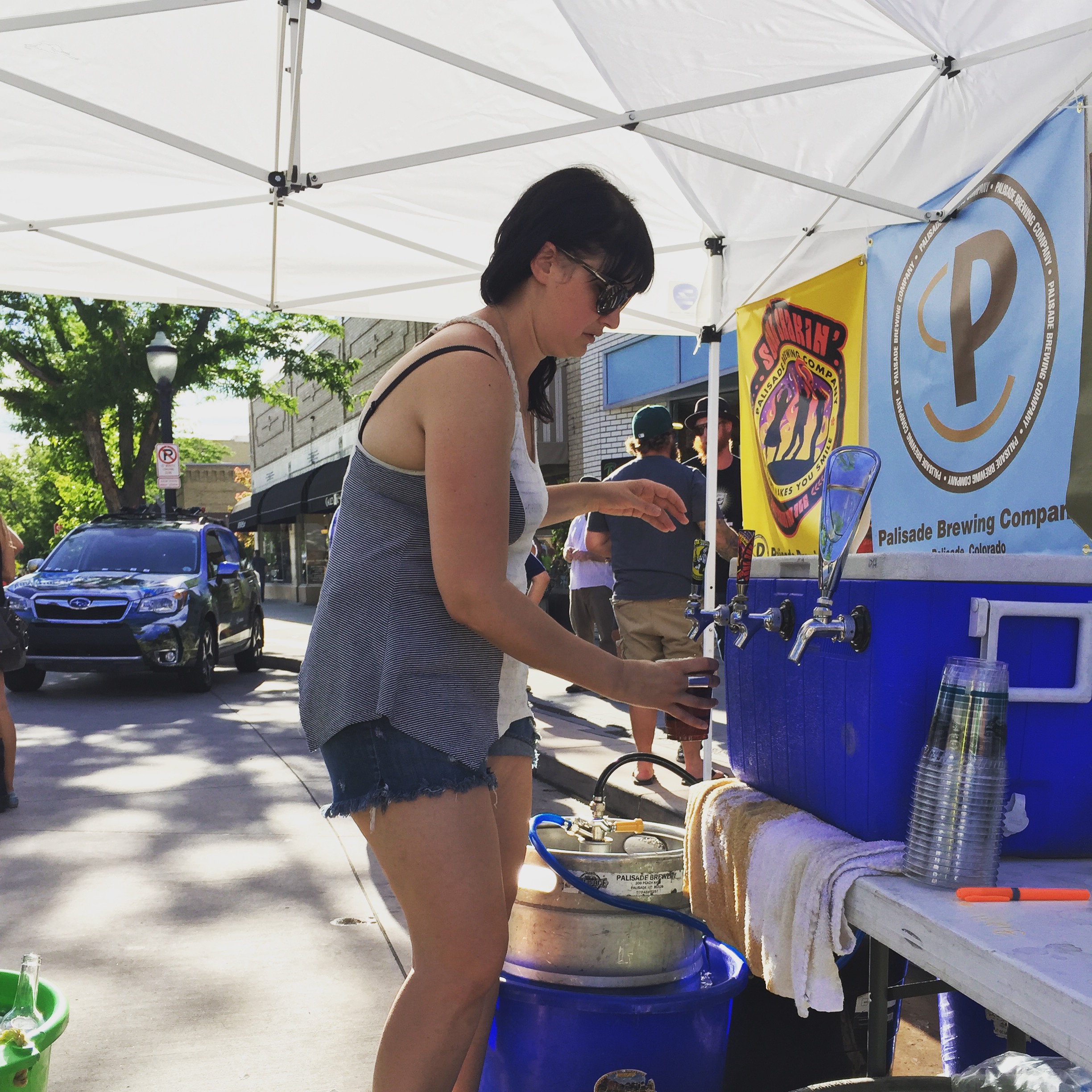 Throughout the weekend everything worked well, music started, staggered, on each of the 4 stages while different rides (15 to 40 miles on the “most technical course in the US”) started and finished on Main Street. Robin and the staff manned the headquarters that was set up on the 500 block of Main, doling out information and water, watching booths as vendors took breaks, making sure the 3 beer tents stayed stocked with ice, beer and wine and that the schedule kept on rolling. I think between the three days, every one of us took a turn helping pour beer as the warm weather demanded cool drinks. I worked for several hours in front of the the 600 block stage pouring local Palisade Brewing Company beer while the line never seemed to grow shorter.